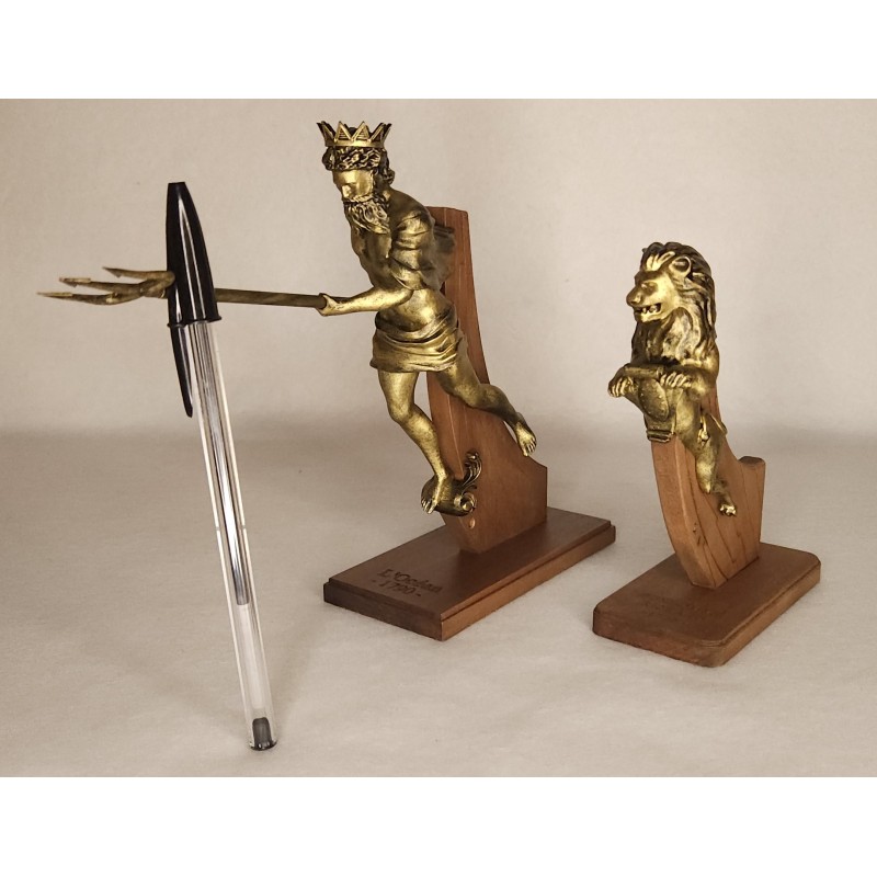 Figura decorativa de resina pintada, presentada sobre un vástago de madera maciza con base, acabada con cera de aceite y barniz transparente mate.