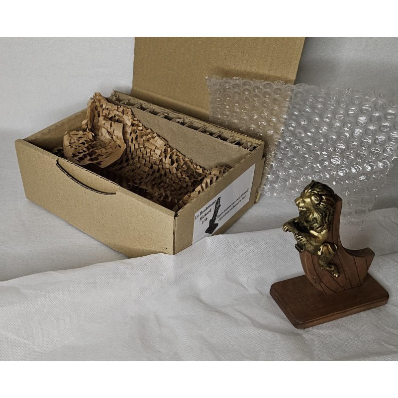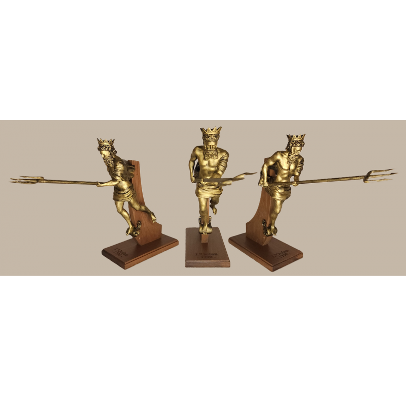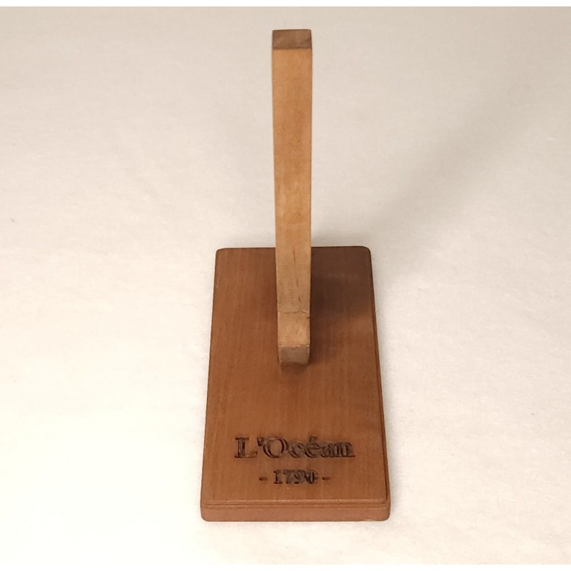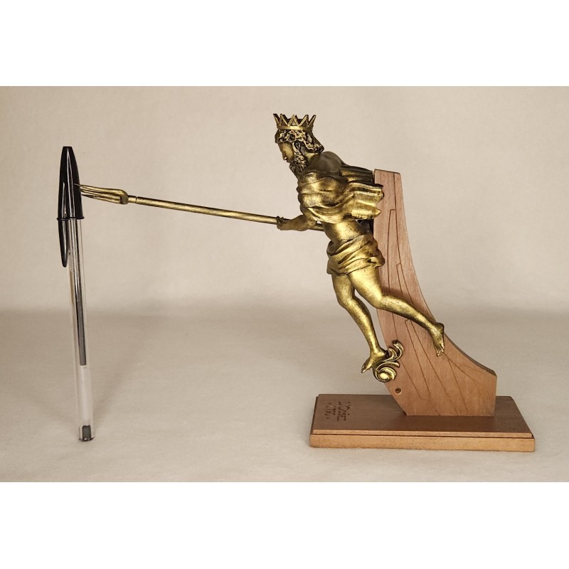 Maqueta decorativa de resina pintada, presentada sobre un vástago de madera maciza con base, acabada con cera de aceite y barniz transparente mate.
